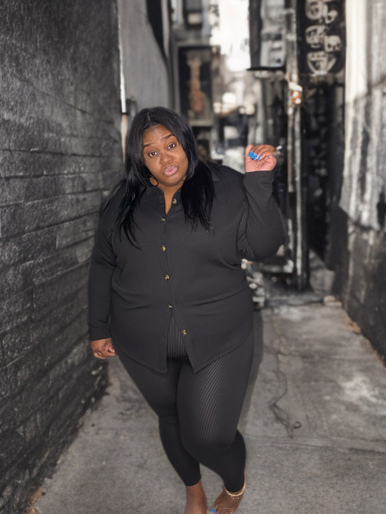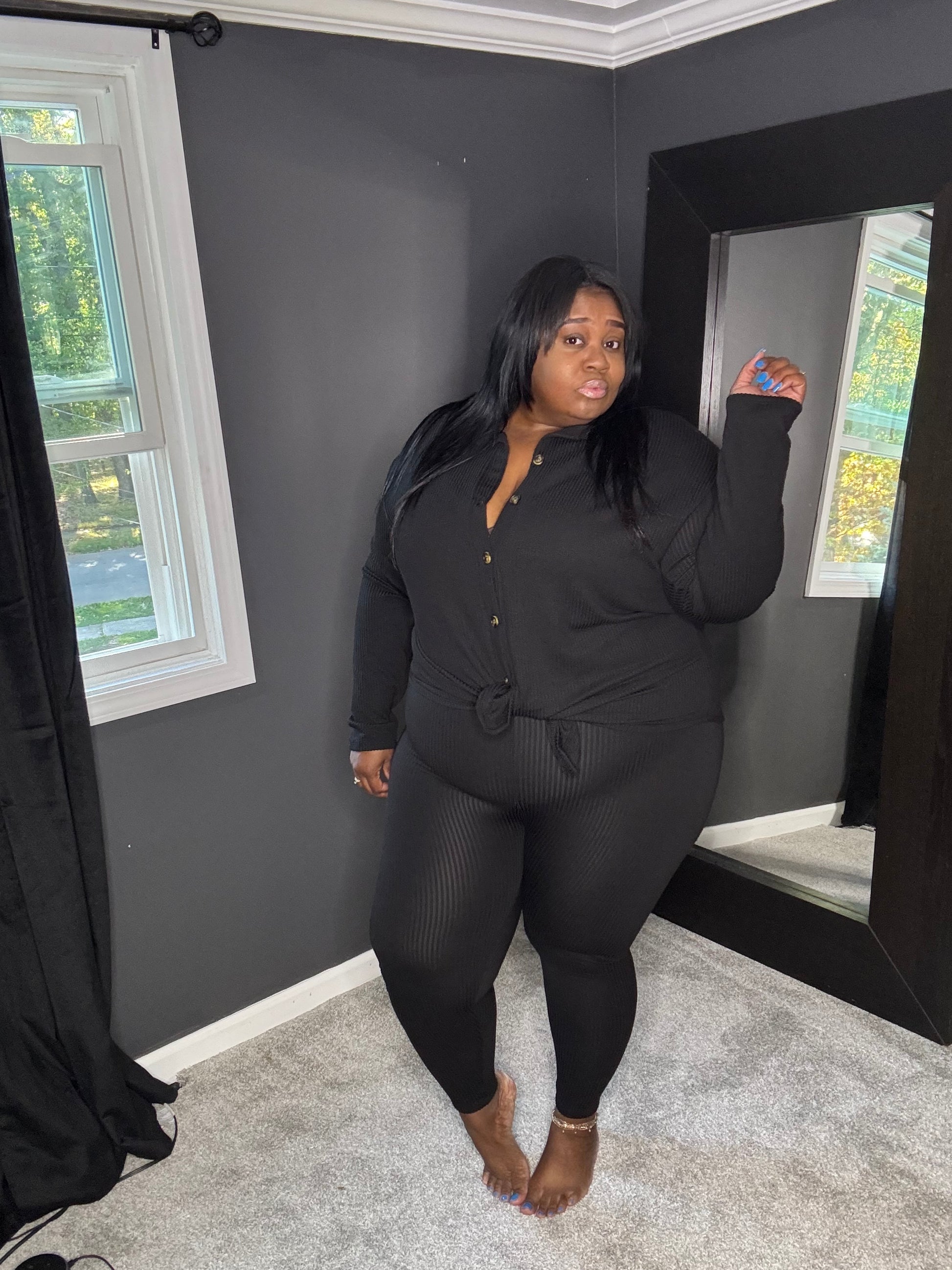 Ribbed 2 piece set. Button down loose fitted top can be worn different ways. Bottoms are true to size. Low stretch. Super cute and fun set!!! If you are more bottom heavy you may want to size up 1 because it’s very low stretch