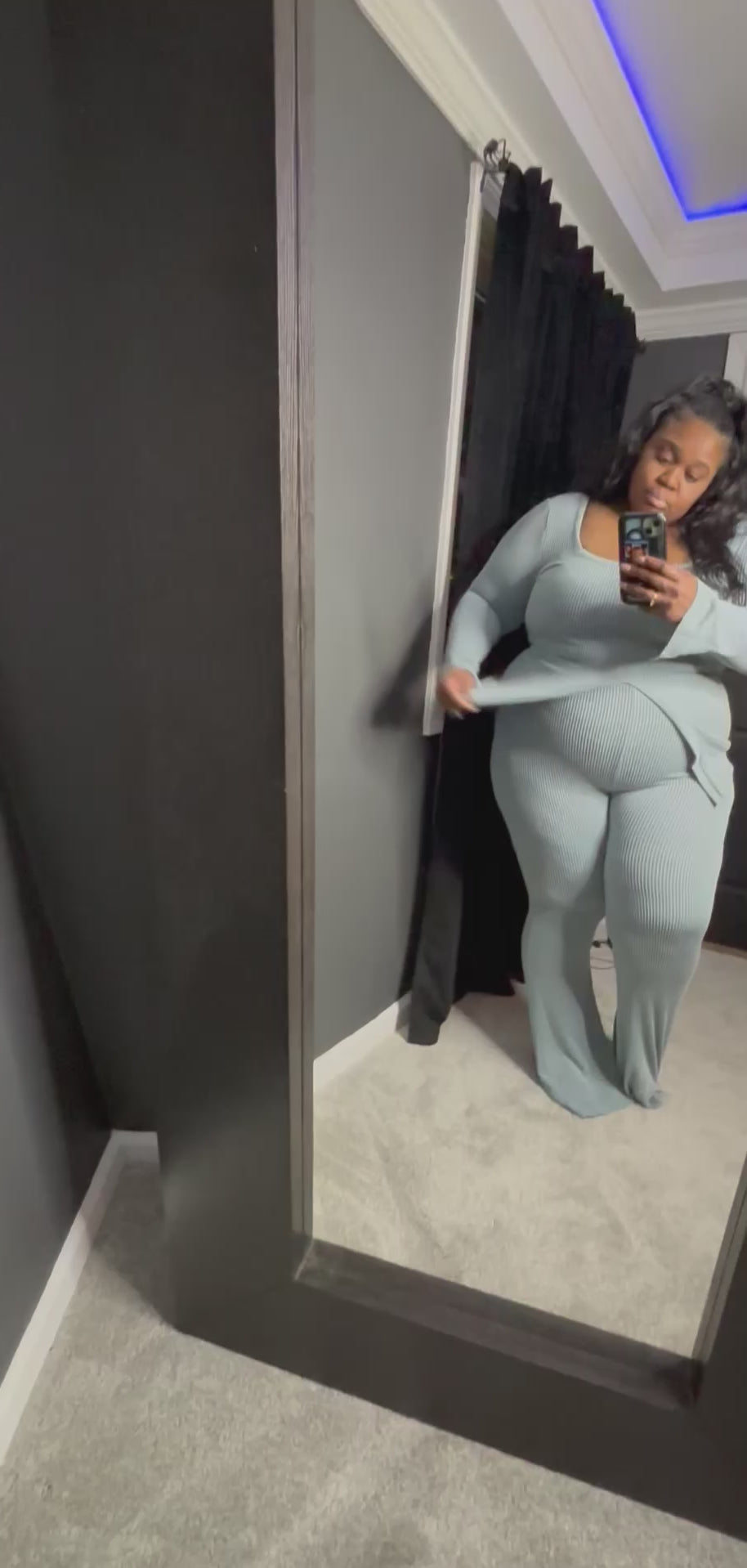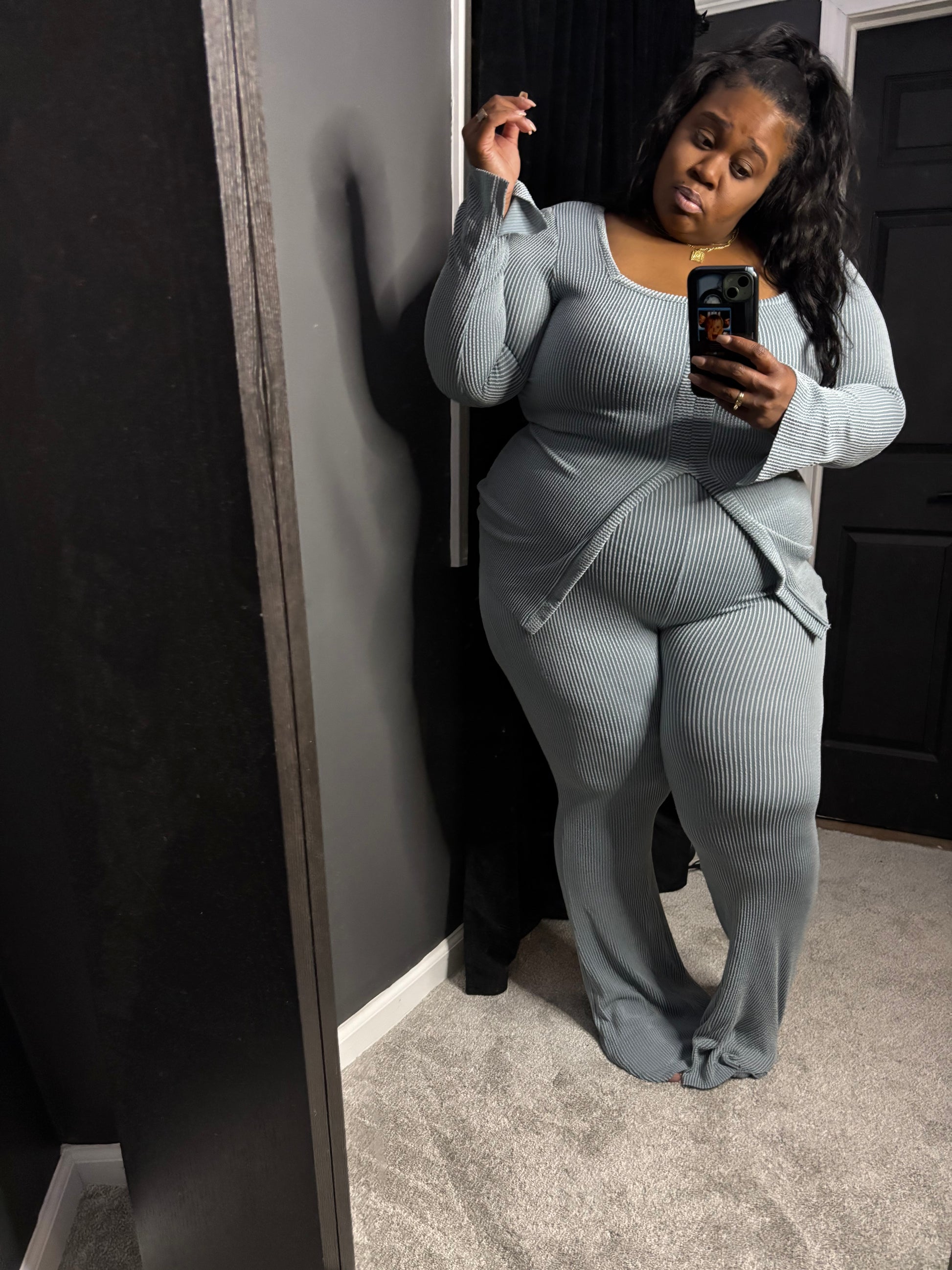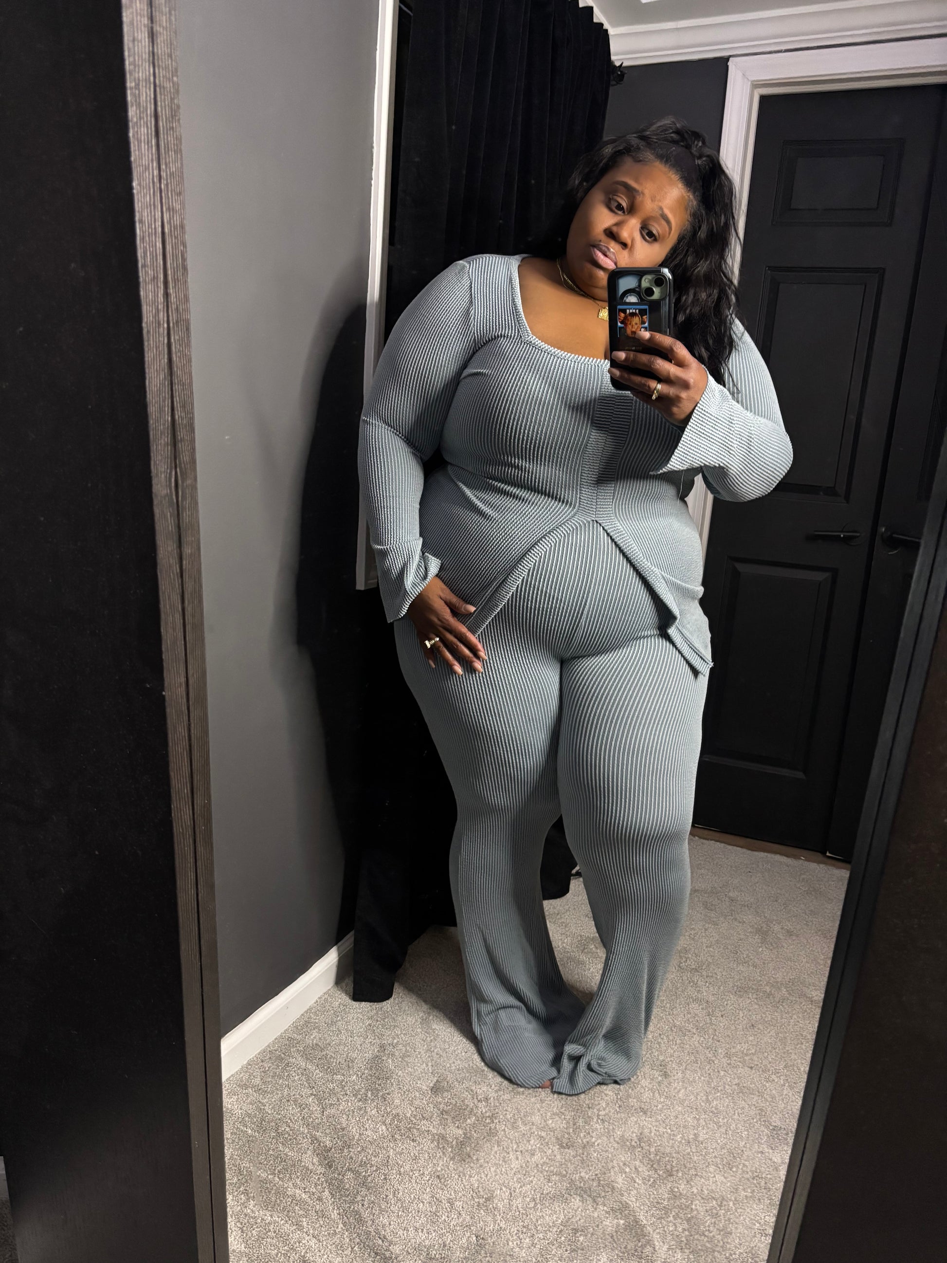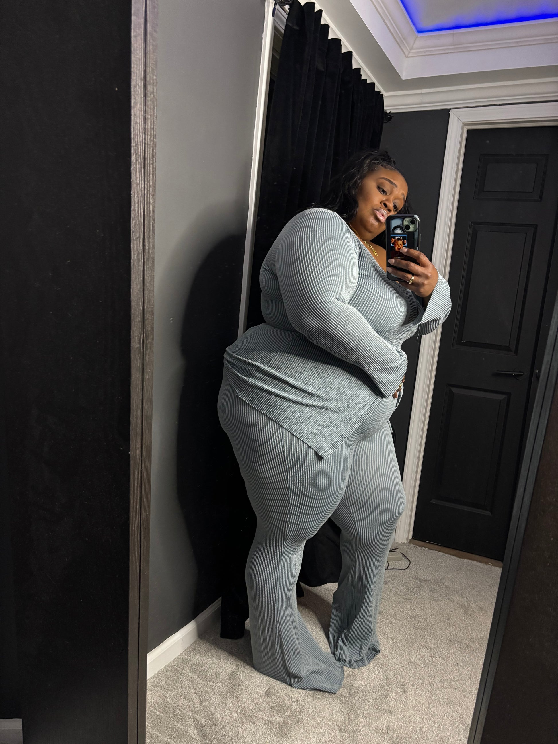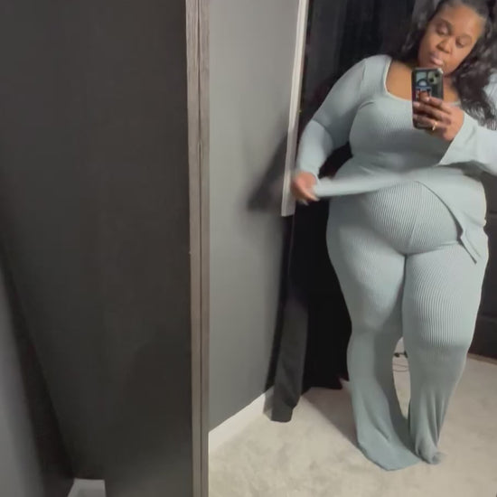 Super soft. Ribbed but very very stretchy set! Tall girl friendly. Cute comfy and a fun set dress it up or down