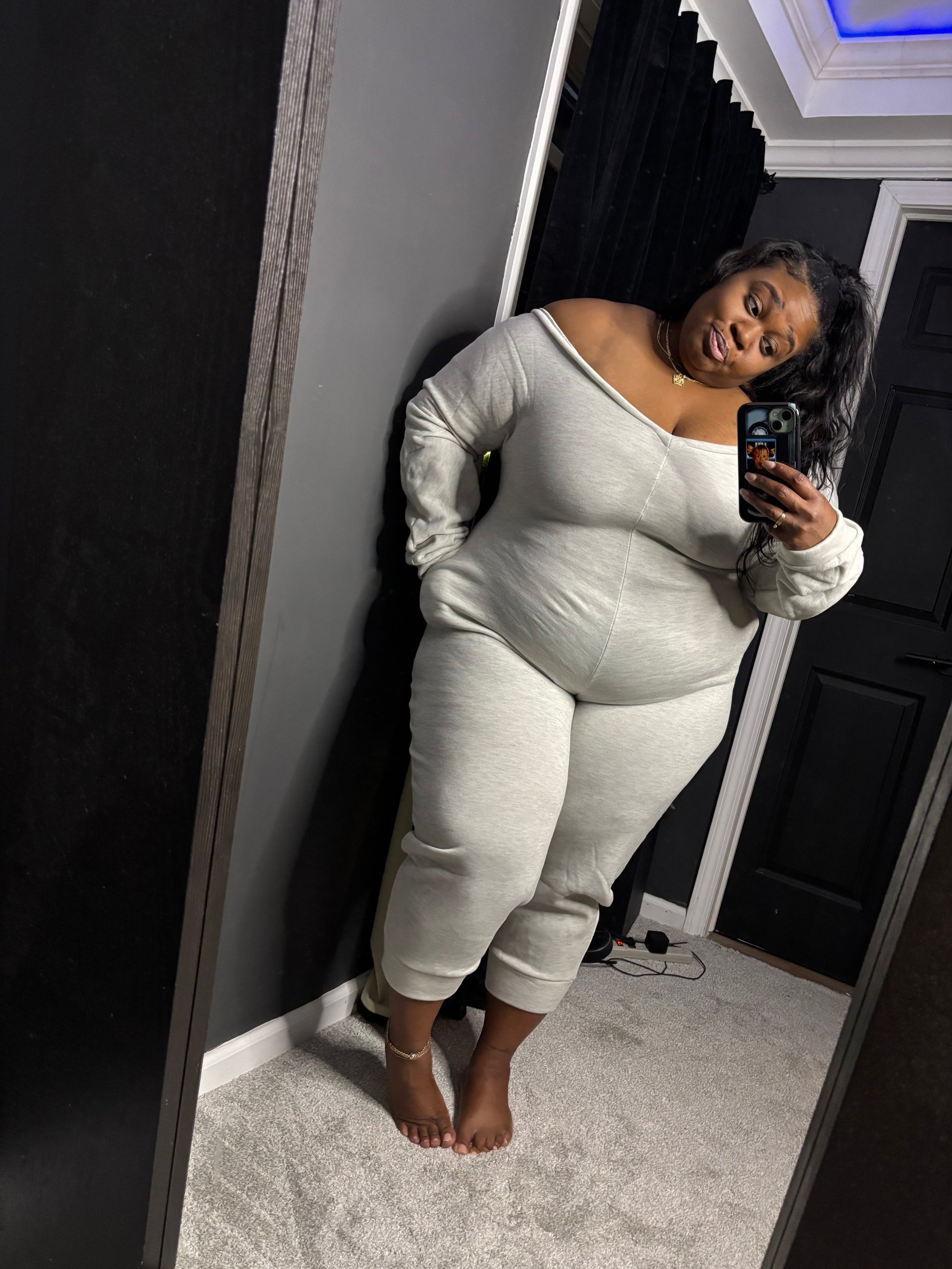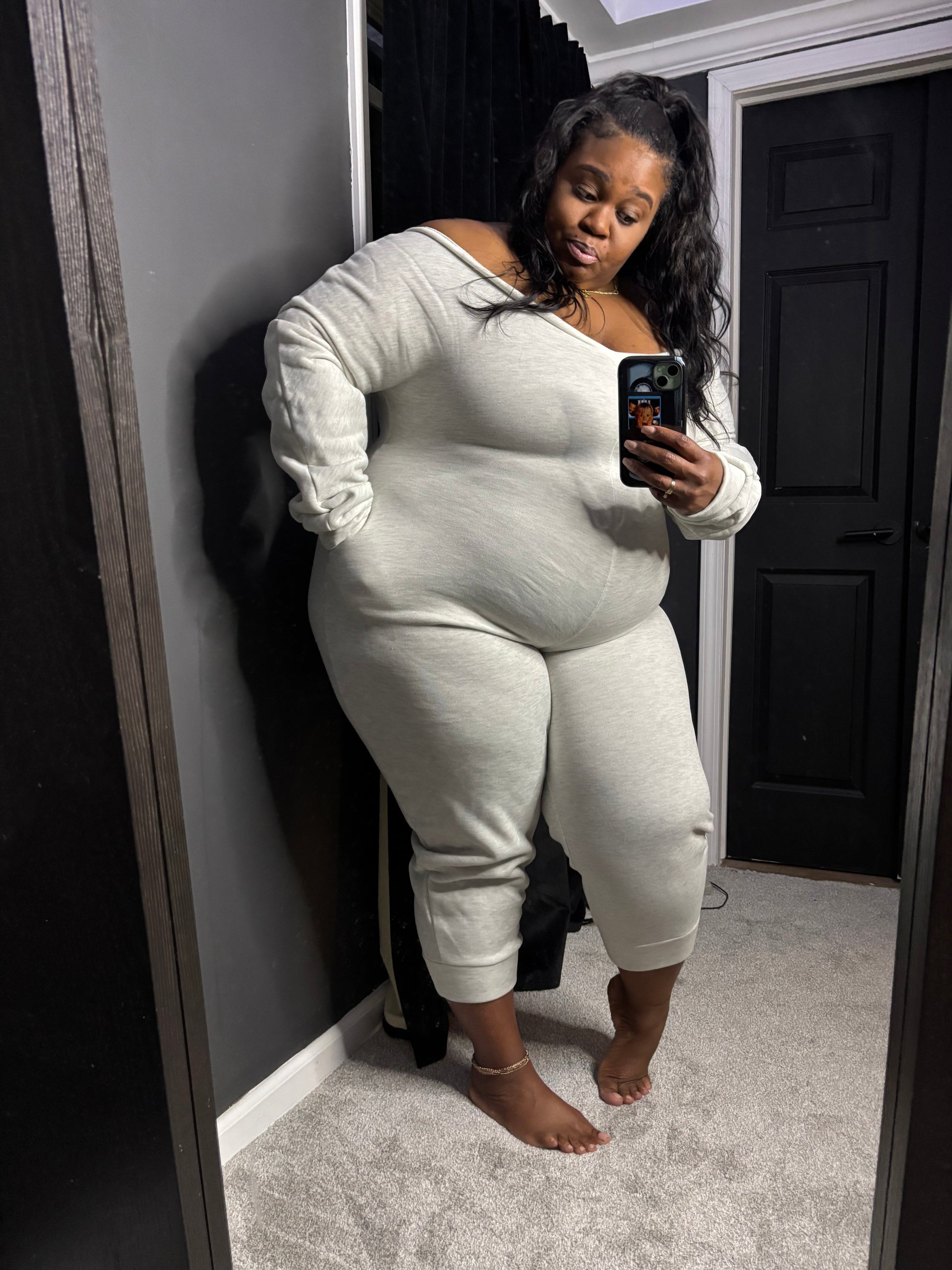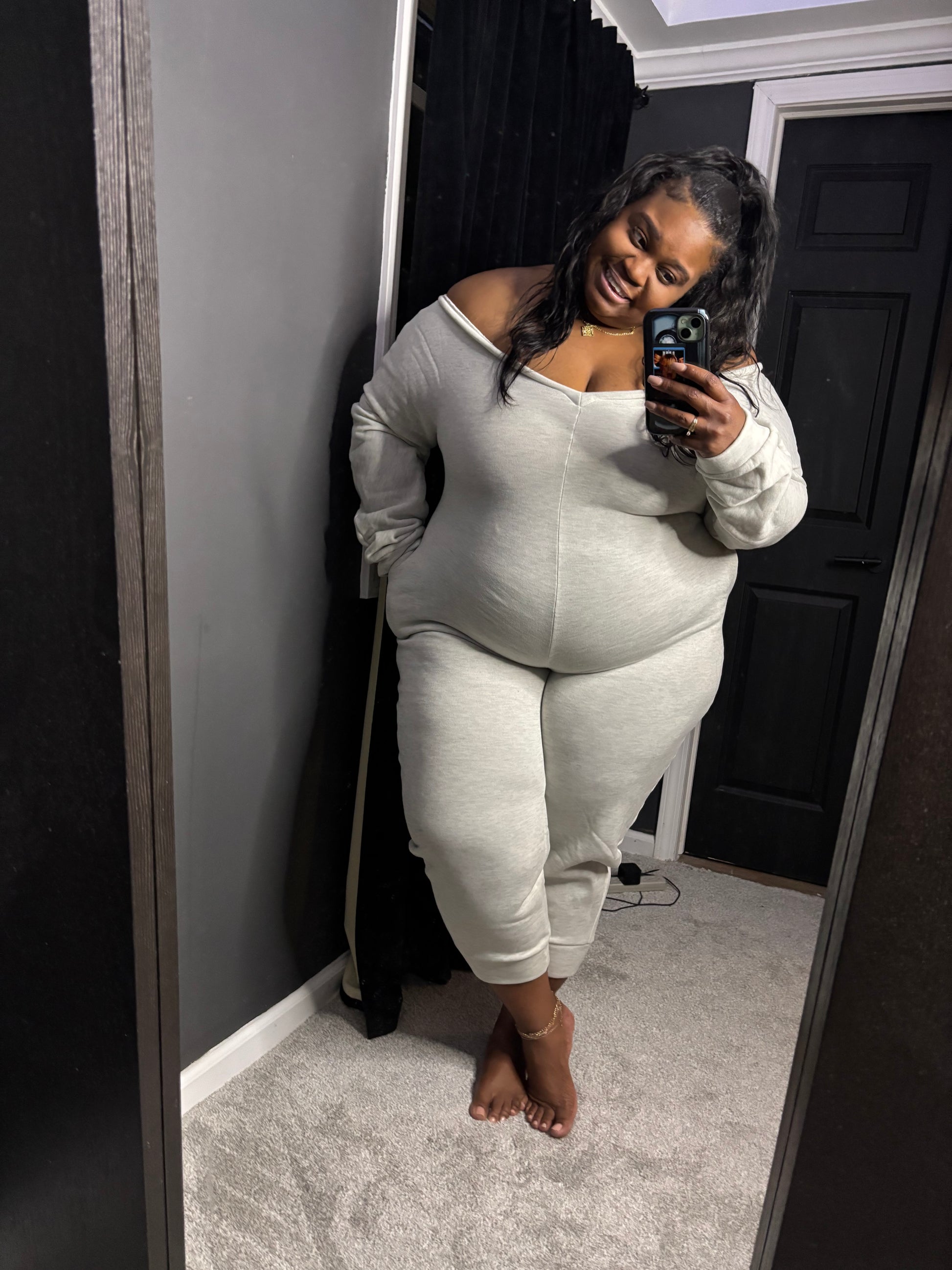 This is a super soft stretchy BUT true to size jumper. It is made of sweat pants material. It has pockets and falls off shoulder!