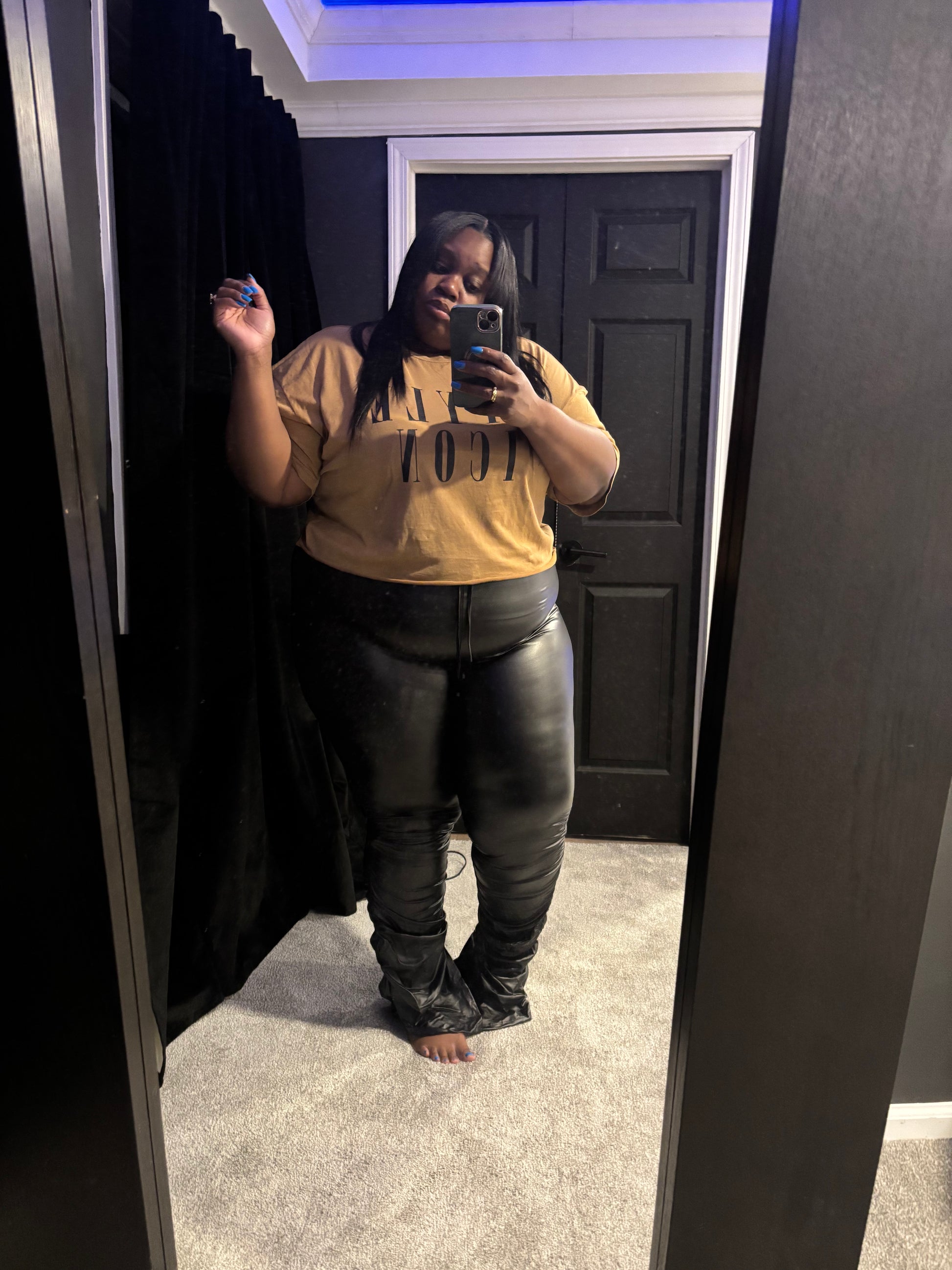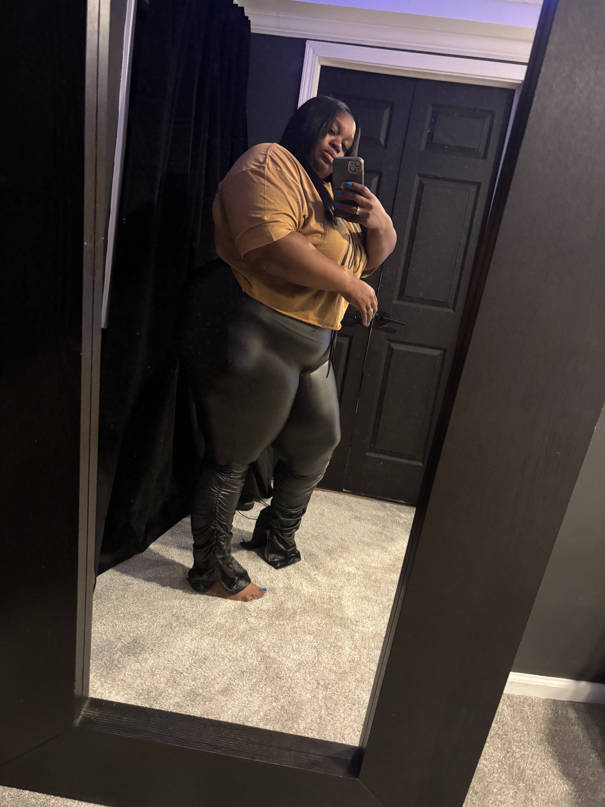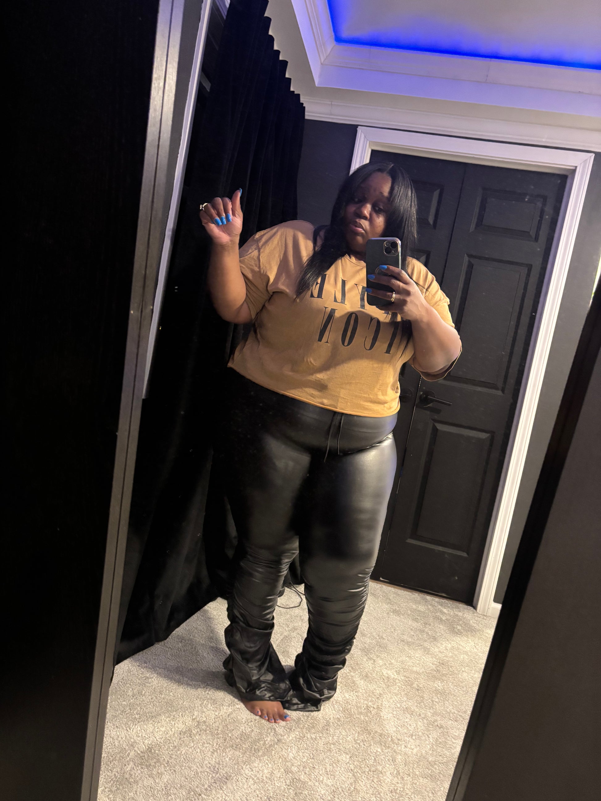 Leather pants and longer style crop top. Both pieces are super stretchy. Pants are tall girl friendly. Pants scrunch leg with drawstring. Top is over sized.